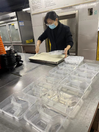 由于酒店处于封控状态,餐饮部工作人员无法进入酒店,餐饮部徐彩玲便带着3名同事在外部餐厅厨房制作、分配好饭食,再运送到酒店门口交接。疫情期间,她每天从早上7点就开始消毒、做卫生,再去取购买的蔬菜肉品,然后为客人准备三餐,一直忙到晚上8点结束。虽然为客人提供免费餐食,但是徐彩玲从未在餐标和程序上打折——每天中晚两顿,都为客人精心准备两荤一素一汤,考虑到入住的有老人孩子,她还用纯牛奶和面做成手工馒头送给大家,让大家体验到家的温暖。