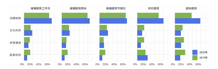 消费购物仍然是国民休闲的基础选项。2023年,城乡居民选择消实地购物、外出就餐、美容美发、游乐游艺等消费购物类休闲活动的占比达58.6%-64.6%。其他休闲选项中,不同人群偏好各异,城市居民注重文化休闲、农村居民更倾向居家休闲,退休居民则大多选择体育健身(图12)。