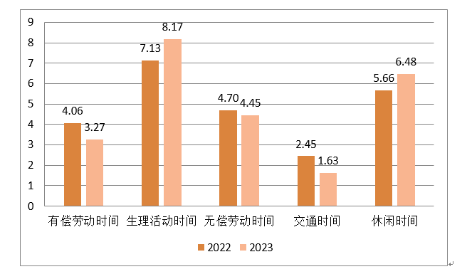 △图3 2022、2023年中国居民年度平均总休闲时长(单位:小时)