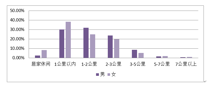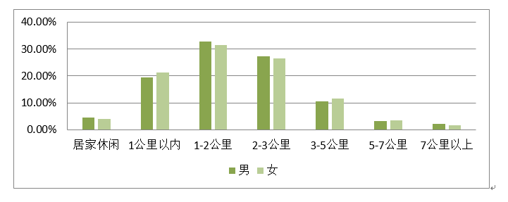 男性退休居民的休闲比女性更加彰显个性。选择2公里以内和5公里以上休闲的男性明显高于女性,而女性主要集中在2-5公里休闲半径(图11)。男性体现了“要么不动、要么走很远”的刚性气质,女性则大多表现得更平和。