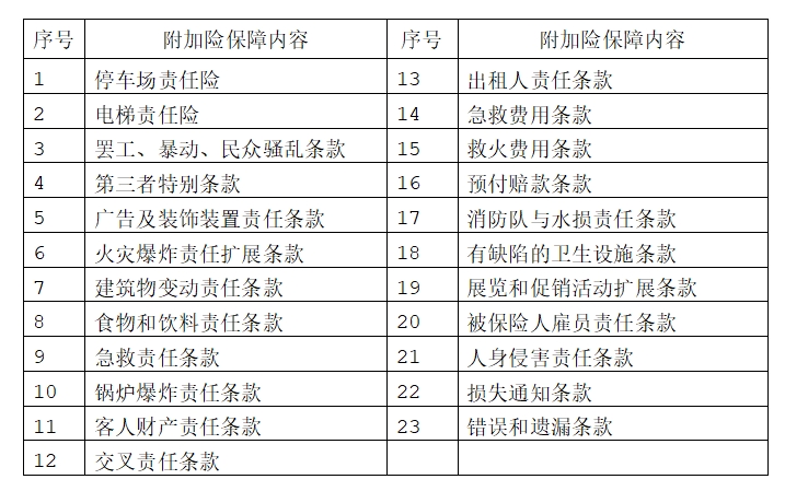 1、在保险期间内,被保险人在保险单载明的区域范围内因经营业务发生意外事故,造成第三者的人身伤亡或财产损失,依照中华人民共和国法律(不包括港澳台地区法律)应由被保险人承担的经济赔偿责任,保险人按照本保险合同约定负责赔偿。